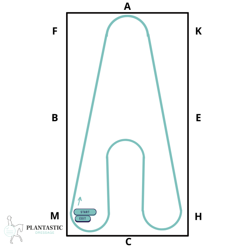 - Daarna doorwenden naar de hoek van C-M en 5m voor M op de hoefslag komen waar je een scherpe bocht maakt richting de H en opnieuw kan beginnen
