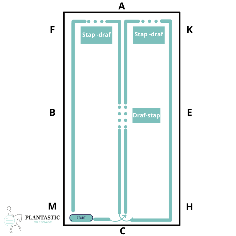 Eerst netjes afwenden bij A in stap, je paard recht maken en dan kan je aandraven. Of binnenkomen in draf en dan halthouden op de G. Zorg ervoor dat je paard na de overgang ook nog goed rechtdoor gaat. Op deze manier kan je ook het halthouden oefenen.